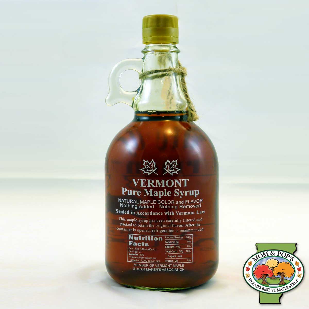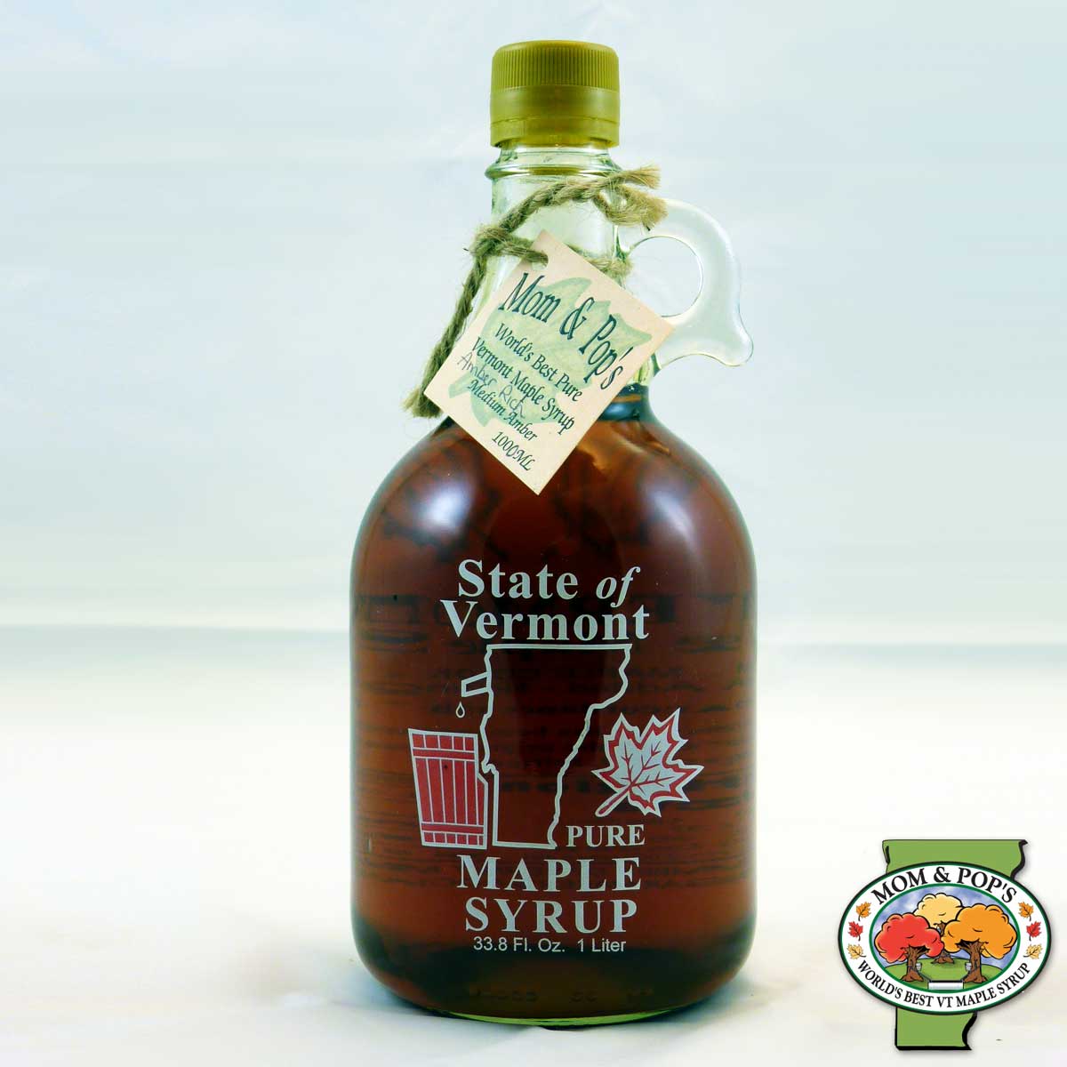 1000 mL (33.8 oz) glass jug filled with Vermont maple syrup.